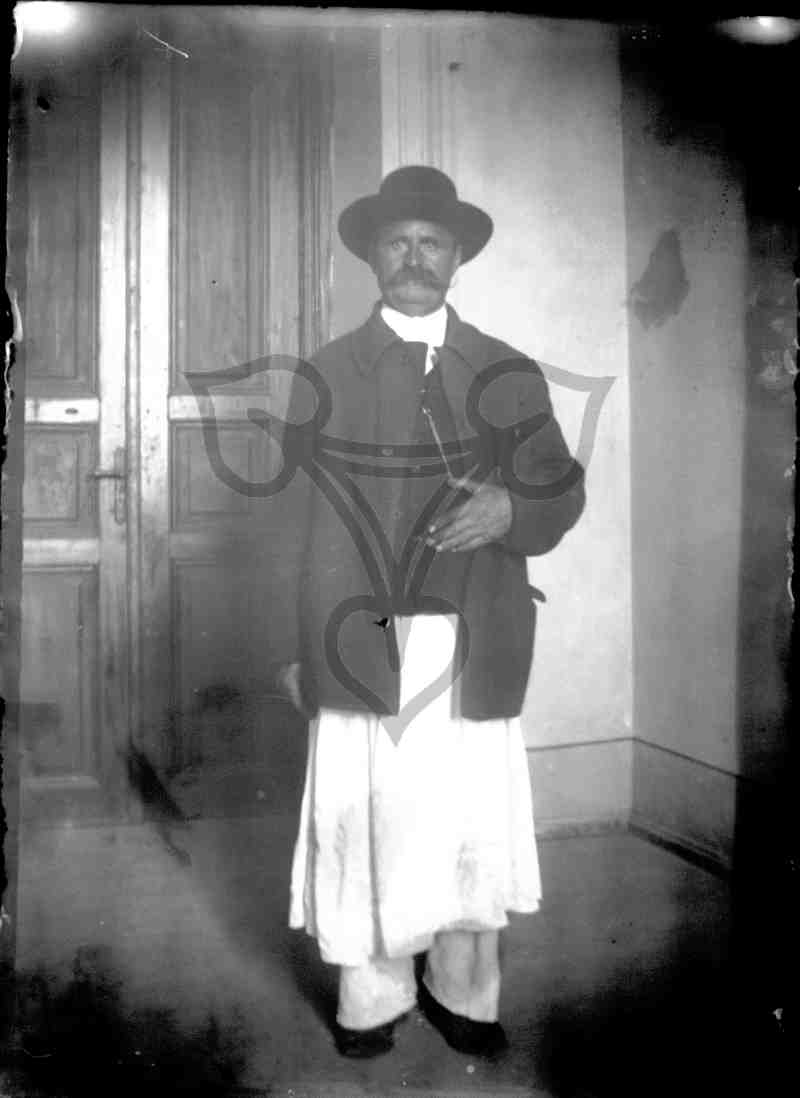 Der Tracht tragende Mann steht aufrecht da und blickt in die Kamera.