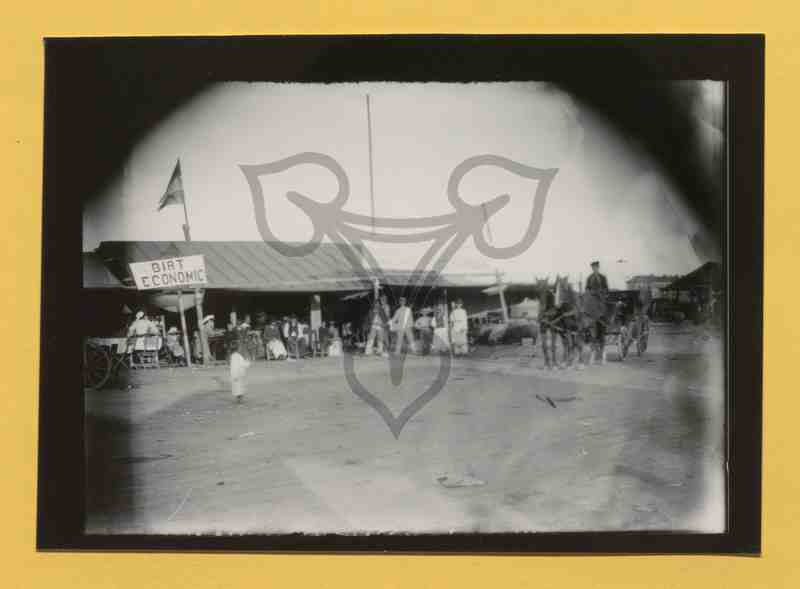 Markttreiben in Caracal. Blick auf eine Zeile hölzerner Verkaufsbuden mit untschiedlichsten Produkten. Davor verteilt einige Personen, am rechten Bildrand eine zweispännige Kutsche.