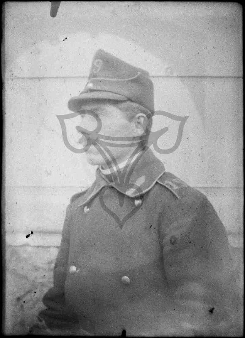 Vor einer hellen Hauswand ist ein nach links gewandter Soldat im Profil abgebildet.