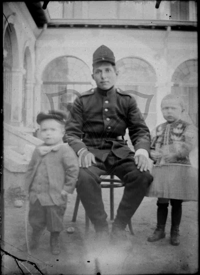 Im Innenhof eines mehrgeschossigen Gebäudes sitzt ein uniformierter Mann auf einem Stuhl und blickt links an der Kamera vorbei. Links von ihm steht ein kleiner Junge, rechts ein etwas älteres Mädchen.