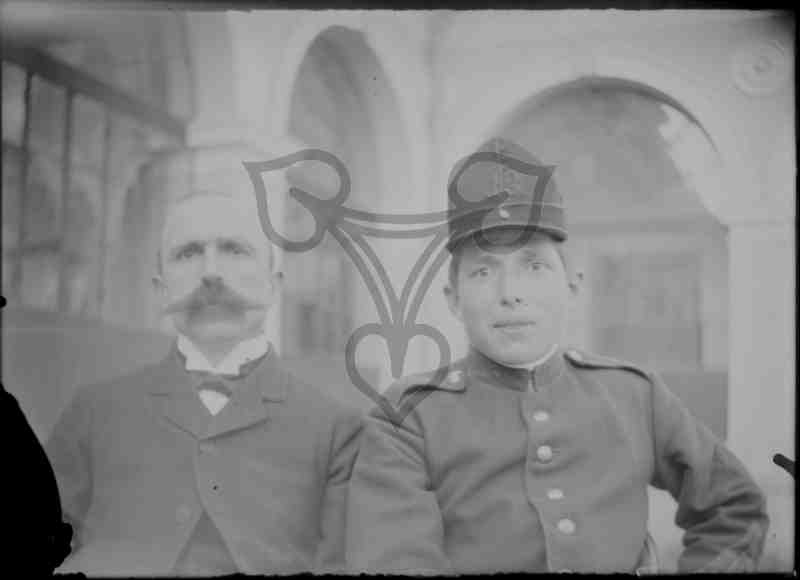 Im Innenhof eines mehrgeschossigen Gebäudes sitzen zwei Männer, der linke im dunklen Anzug, der rechte in Uniform.