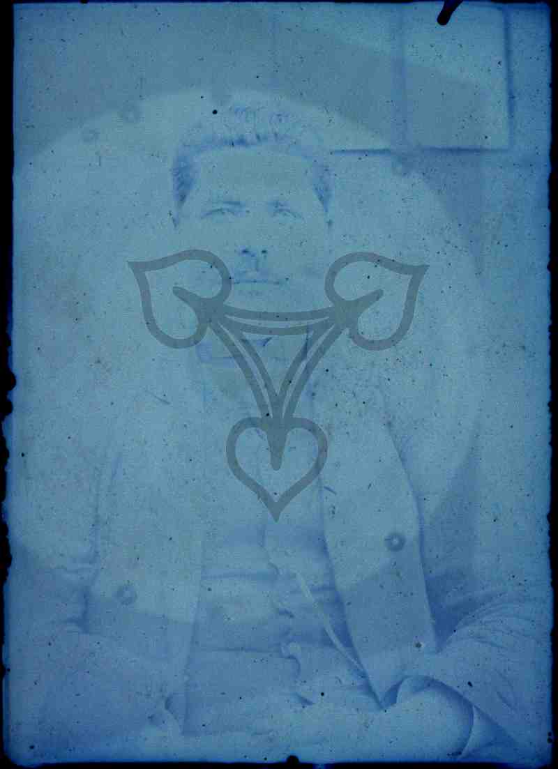 Vor einer zum großen Teil verglasten Hauswand im Freien sitzt ein Mann und blickt in die Kamera. Stark überbelichtete Glasplatte.