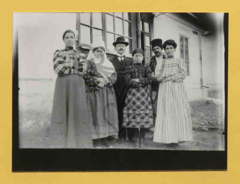 Details: Grup in fața casei lui Teodor Negoescu, telegrafist. 1. Anica Gh. Smărăndescu. 2. Pătru Voinea, Släveni. ("Muma" vitrega a lui socru-său). 3. Teodor Negoescu 4. Maria (Maruca) Gr. P. Voinea, Släveni cumnaă. 5. Fin al 6. Aretica Teodor Negoescu