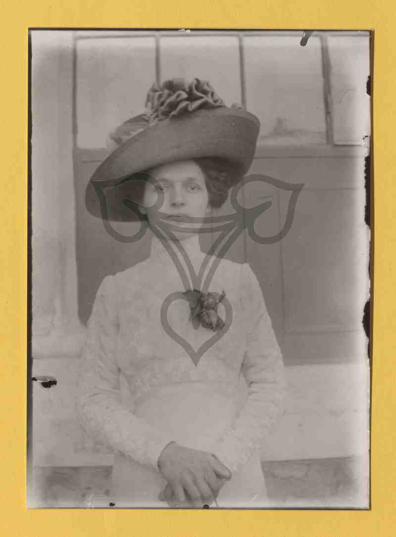 Vor einer zum großen Teil verglasten Hauswand im Freien sitzt eine Frau auf einem Stuhl. Sie trägt ein weißes Kleid mit einer großen Stoffbrosche(?) auf der linken Brust und einen dunklen Hut.