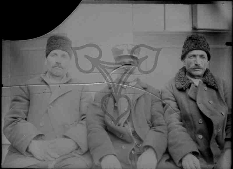 Vor einer zum großen Teil verglasten Hauswand sitzen drei Männer im Freien auf Stühlen. Die beiden äußeren tragen Elemente der rumänischen Arbeitstracht, der Mittlere die Uniform der rumänischen Bahnangestellten.