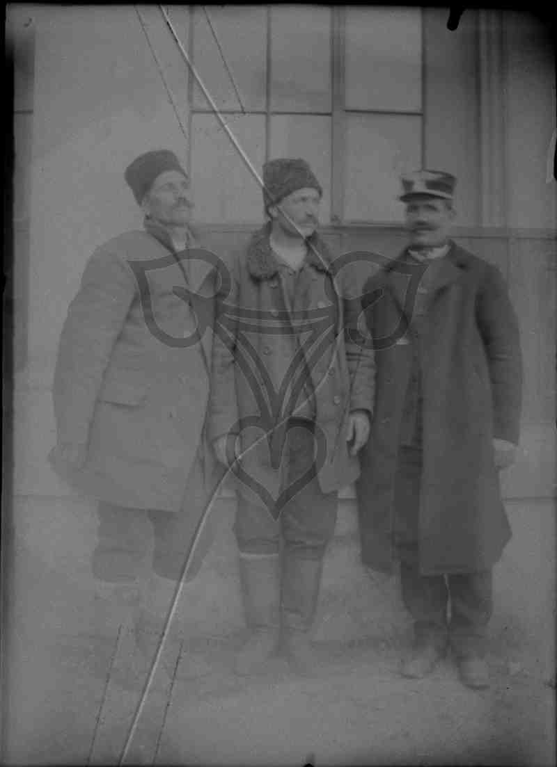 Vor einer zum großen Teil verglasten Hauswand stehen drei Männer. Die beiden linken tragen Elemente der rumänischen Arbeitstracht, der linke die Uniform der rumänischen Bahnangestellten.