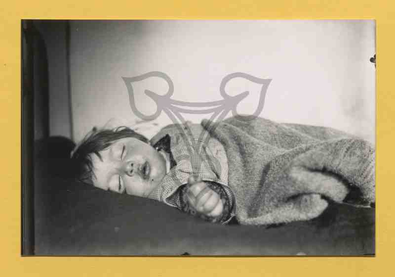Ileana Ilie Constantinescu 1 an si 6 luni, culcată în pat, adormită. Cu fața spre apus (unde e fereastră) in patul lui Elisei