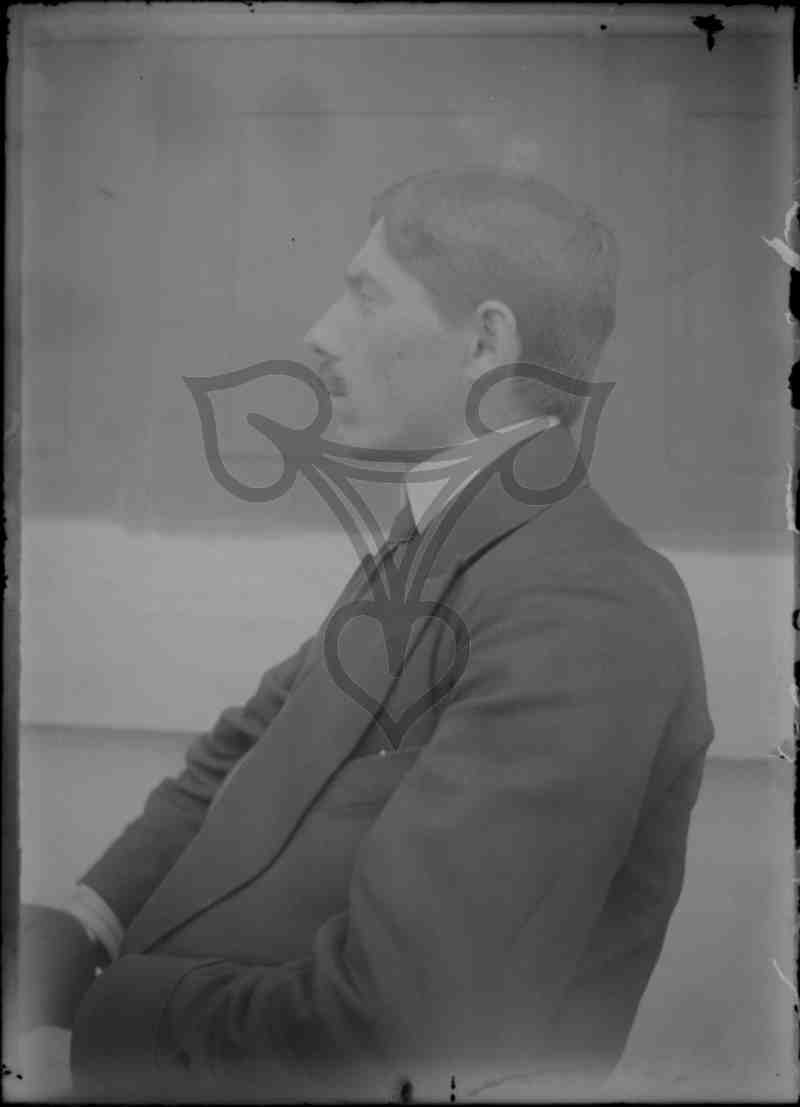 Der Mann trägt einen schwarzen Anzug, sitzt im Freien auf einem Stuhl, ist nach links gewandt und blickt geradeaus nach links.