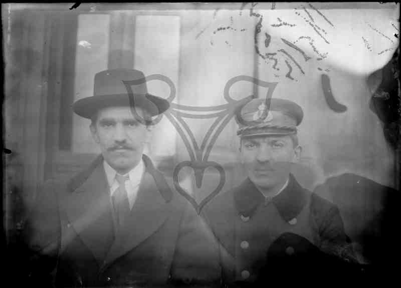 Halbbrustporträt zweier nebeneinander stehender Männer. Der linke trägt einen dunklen Mantel, ein weißes Hemd, eine dunkle Krawatte sowie einen dunklen Hut. Der rechte trägt eine dunkle Uniform.