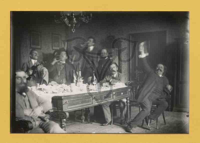 Das Bankett in der Kanzlei des Gymnasiums. Um einen mit Getränken und Lebensmitteln belegten Schreibtisch herum sitzen und stehen mehrere heitere Männer.