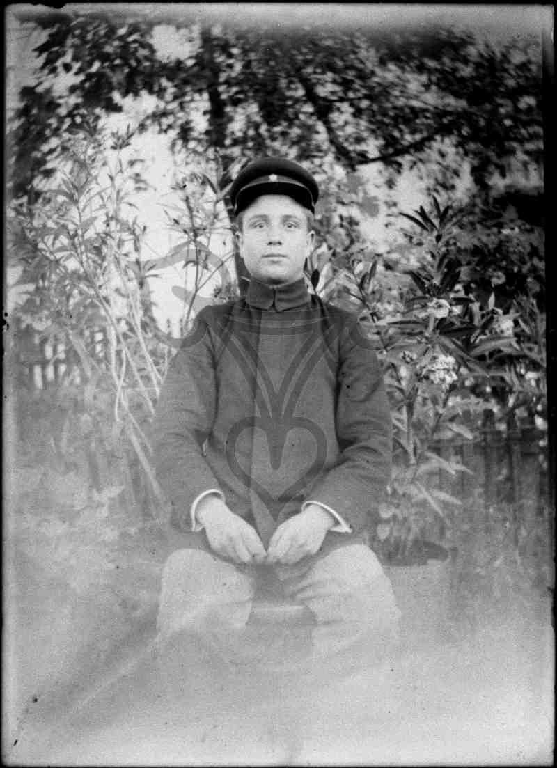 Abgebildet ein sitzender junger Mann in dunkler Uniform. Im Hintergrund ein Holzzaun, Büsche und eine helle Gebäudewand.