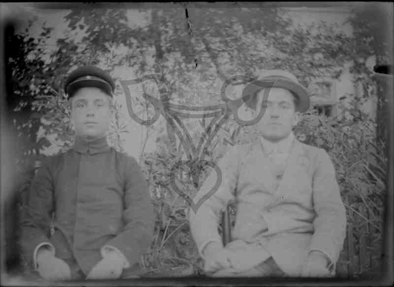 Abgebildet sind zwei sitzende junge Männer, der linke in einer dunklen Uniform, der rechte in einem hellen Anzug. Im Hintergrund ein Holzzaun, Büsche und eine helle Gebäudewand.