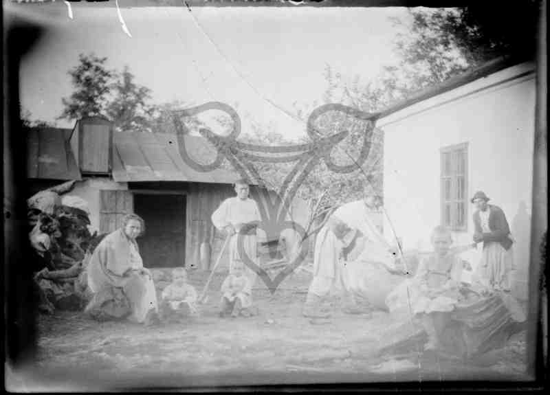 Ansicht eines Innenhofes. Ganz links liegen einige gefällte Baumstämme, rechts daneben ein Schuppen, noch weiter rechts das Haupthaus. Auf einem der Baumstämme sitzt eine Frau, rechts von ihr zwei Kinder, hinter dem rechten Kind steht ein Mann und stützt sich auf einer Axt ab. Vor der Wand des Haupthauses vor einem Fenster stehen zwei Männer und zersägen mit einer Zweimann-Schrotsäge einen Stamm. Vor ihnen, in der rechten unteren Bildecke, sitzt ein weiteres Kind auf einem Stamm. Alle Personen tragen die rumänische Arbeitstracht. Vgl. auch PB 207/383.