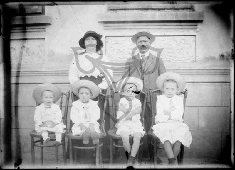 Vor einer hellen Hauswand im Freien hat sich die Familie des Fotografen aufgebaut, hinten stehend die Eltern, davor auf Stühlen sitzend die vier Kinder.