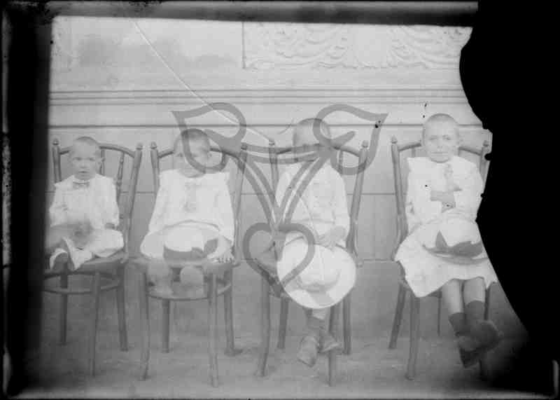 Vor einer hellen Gebäudewand sitzen auf Stühlen nebeneinander dem Alter bzw. der Größe nach geordnet die vier Kleinkinder des Fotografen. Das kleinste ganz links, das älteste ganz rechts. Alle sind sie weiß gekleidet, der Junge ganz links in weißem Hemd und Hose mit bunter Fliege, die drei Mädchen rechts von diesem in weißen Kleidchen. In den Händen auf dem Schoß halten die Mädchen ihre Hüte fest. Alle Kinder sind kahl geschoren.
