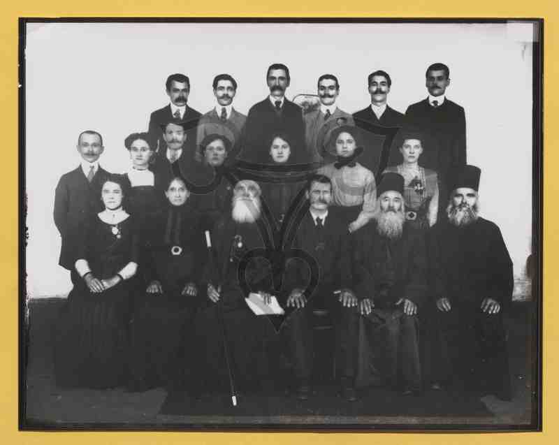 Vor einer hellen Wand sind in drei Reihen sitzend und stehend mehrere Frauen und Männer nebeneinander gruppiert. In der vordersten Reihe sitzen drei orthodoxe Popen.