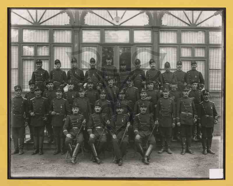 Vor einem Gebäude mit verglaster Fassade sitzen bzw. stehen in mehreren Reihen hintereinander uniformierte Soldaten und blicken in die Kamera.