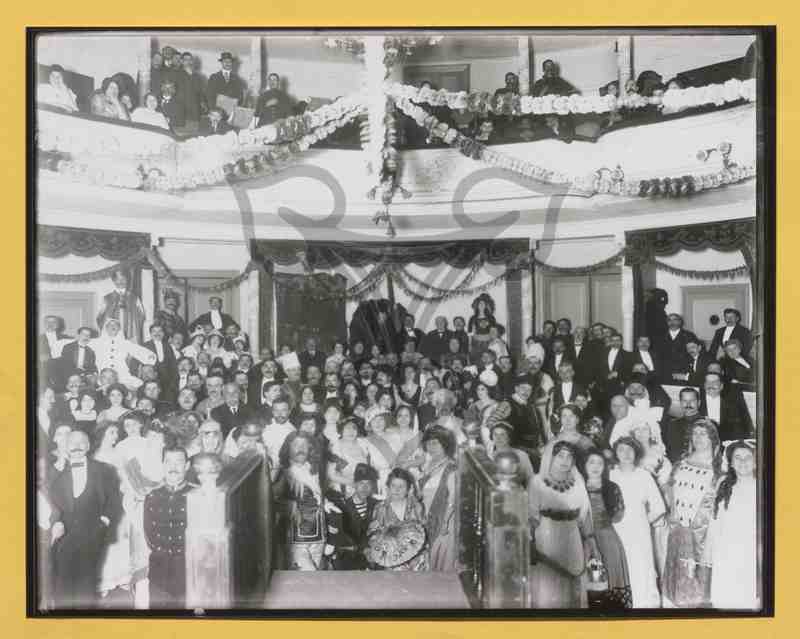 Blick in einen mehrgeschossigen festlich geschmückten Saal. Parkett und Empore sind mit Kostüm tragenden Personen überfüllt.