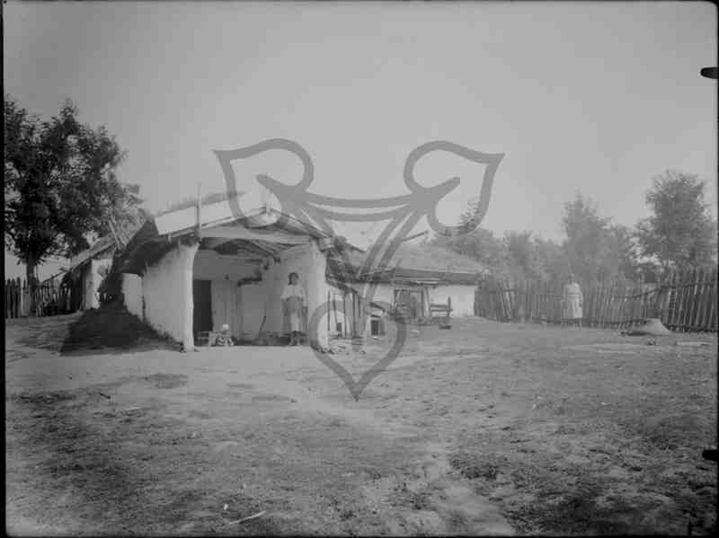 Zu erkennen ist eine weiß getünchte Erdhütte mit großem überdachtem Treppeneingang in die Tiefe. Ein Kleinkind spielt da und eine Frau steht aufrecht an die Wand gelehnt. Weiter rechts, neben der Hütte vor einem hölzernen Lattenzaun, steht eine weitere Frau. Beide tragen die rumänische Arbeitstracht und blicken in die Kamera. Im Hintergrund Bäume.