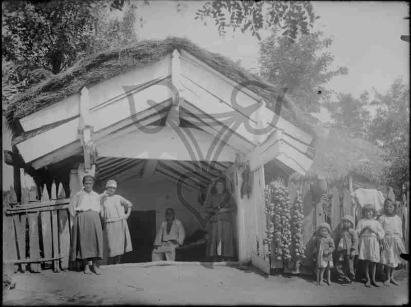 Außenansicht des überdachten Eingangs einer Erdhütte mit einem mit Maisstauden abgedeckten und Lehm oder Erde abgedichteten Dach. Neben dem Eingang ein hölzerner Zaun aus senkrechten Brettern. Auf den Stufen zum Eingang links zwei ältere Mädchen, rechts im Hintergrund ein älterer Mann, weiter vorne eine ältere Frau. Vor dem Zaun links stehen der Größe nach aufgestellt zwei Jungen und zwei Mädchen.