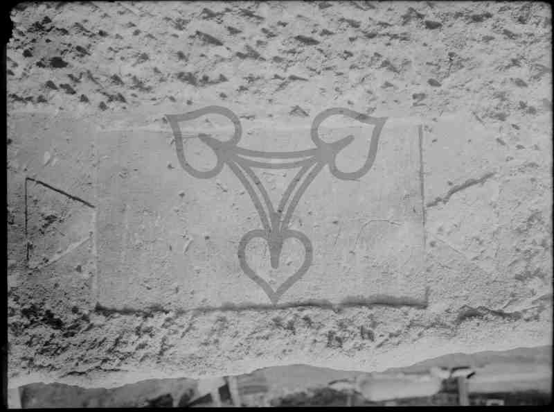 Abgebildet ist ein in Stein gemeißeltes Rechteck mit zwei Dreiecken an der Längsseiten, deren stumpfe Spitzen an das Rechteckt anschließen. Um die Figur befindet sich behauener Stein.