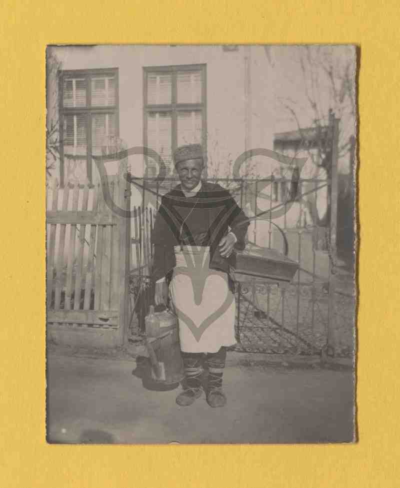 Der Hirsetrankverkäufer steht vor einem Hoftor aus Metall, hält in der linken Hand einen Kanister, in der rechten einen Korb und blickt in die Kamera. Im Hintergrund ein Wohnhaus.