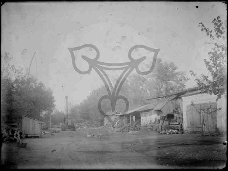Entlang eines unbefestigten Weges ziehen sich an der rechten Seite mehrerer Wirtschaftsgebäude entlang. Rechts dahinter Bäume. Links der Gebäude am Ende des Weges befindet sich auf Rädern der Antriebskessel einer Dreschmaschine mit Dampfbetrieb. Am linken Bildrand, von Bäumen verdeck, ein Brunnen mit hohem, hölzernen Zugarm und davor ein hölzernen Hasen- oder Hühnerstall.