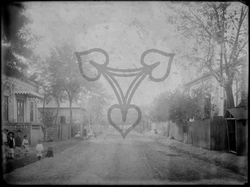 Bildmittig ist der Verlauf der unbefestigten Straße zu erkennen. Links und rechts von dieser je ein Abflussgraben, dann der ebenfalls unbefestigte, teils sehr schmale Bürgersteig, sowie, teilweise hinter Holzzäunen, die Flucht der Wohngebäude. Auf dem linken Bürgersteig überwiegend Kinder in Tracht.