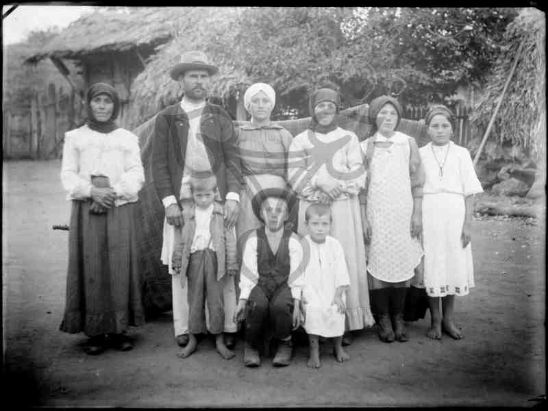 Auf einem Hof vor einem aufgespannten karierten Stück dunklen Stoffs ist in zwei Reihen eine Familie nebeneinander aufgebaut. In der hinteren Reihe stehend ein erwachsener Mann, zwei ältere Frauen (offenbar Schwestern), ein jüngere rechts neben dem Mann sowie zwei ältere Mädchen ganz rechts. In der vorderen Reihe sitzen zwei Kinder und ein weiterer Junge wird von dem Mann an dessen Schultern vor sich gehalten. Alle tragen Trachtelemente und blicken in die Kamera. Im Hintergrund links ein hölzerner Zaun, eine strohgedeckte Holzhütte, Obstbäume sowie ganz rechts ein Heuschober.