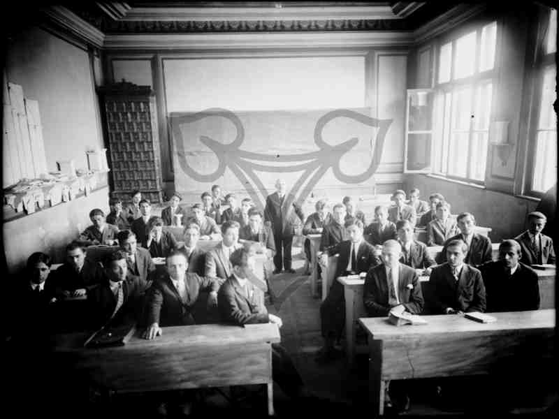 Bildmittig im Hintergrund steht zwischen zwei Schulbankreihen der Lehrer, stützt sich links und rechts auf den Bänken ab und blickt in die Kamera. In den Bänken sitzen zu dritt bzw. zu viert ausschließlich männliche Schüler. Sie tragen alle dunkle Anzüge, weiße Hemden und bunt gemusterte Krawatten. In der hinteren linken Raumecke ein großer Kachelofen, rechts daneben vermutlich eine Tafel, am rechten Bildrand eine Fensterfront. Vgl. auch PB 207/541.