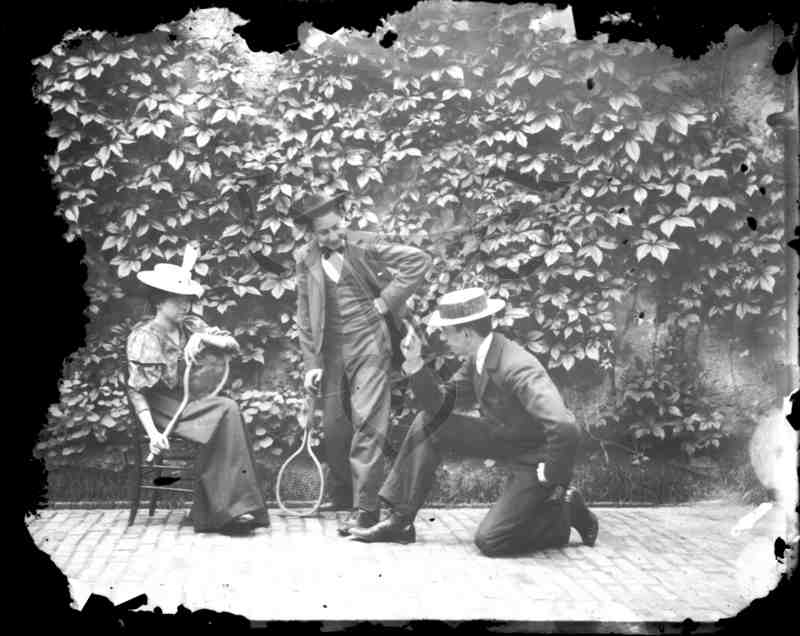 Außenaufnahme. Vor einer mit Efeu bewachsenen Mauer sind drei Personen abgebildet. Ganz links eine sitzende Frau, ein neben ihr stehender Mann und ganz rechts ein auf dem rechten Bein kniender Mann. Die Frau trägt einen dunklen Rock, eine bunt gemusterte Bluse und einen weißen Hut. In der Hand hält sie einen Tennisschläger. Die beiden Männer tragen dunkle Anzüge mit weißen Hemden, der stehende einen schwarzen, der kniende einen weißen Hut. Der stehende Mann stützt sich auf einen Tennisschläger in der rechten Hand. Der Boden ist gepflastert, am rechten Bildrand angeschnitten ist ein Regenrohr zu erkennen.