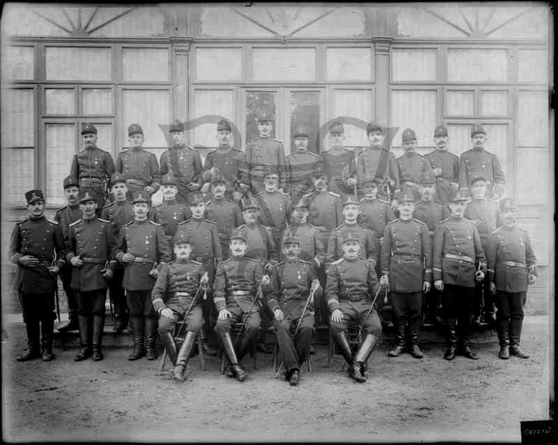 Vor einem Gebäude mit verglaster Fassade sitzen bzw. stehen in mehreren Reihen hintereinander uniformierte Soldaten und blicken in die Kamera.