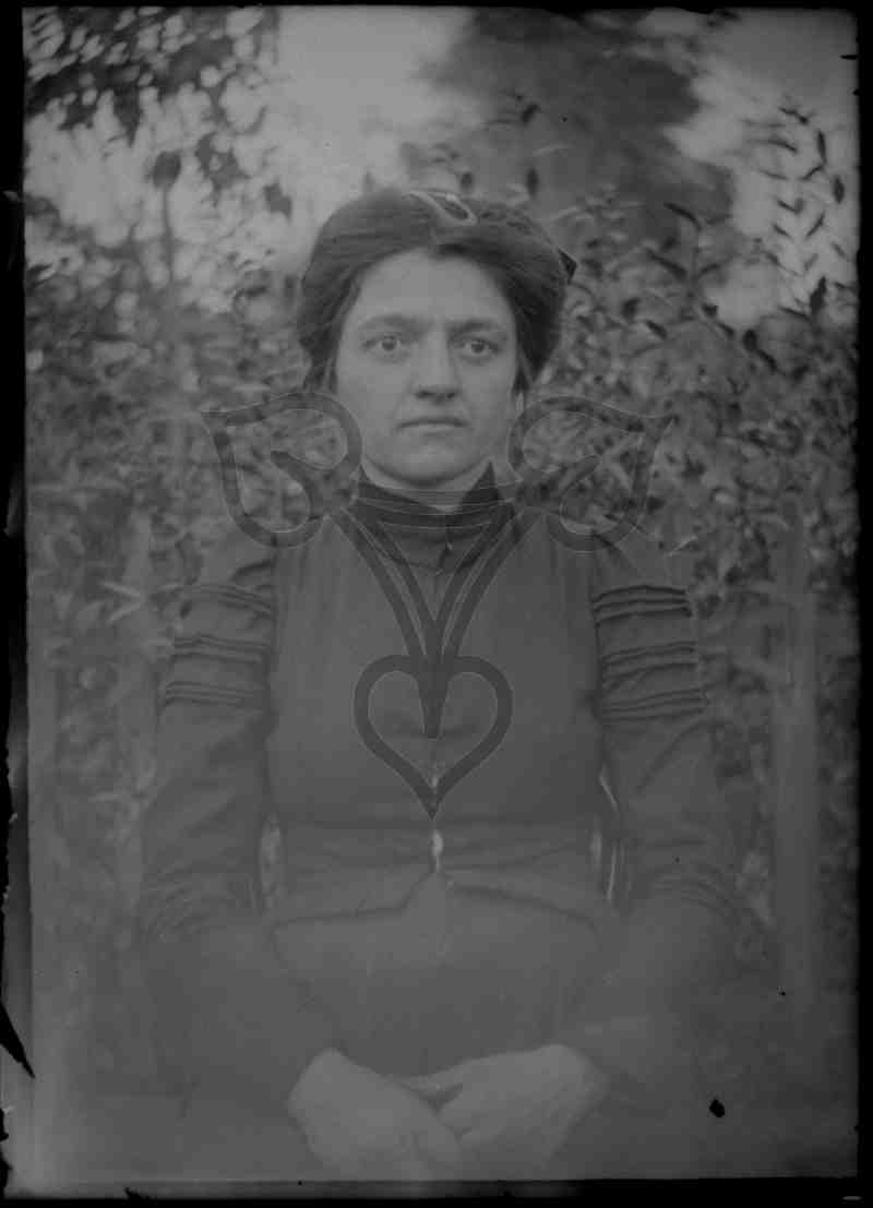 Die mit einem dunklen Kleid bekleidete Frau sitzt im Freien und blickt rechts an der Kamera vorbei. Im Hintergrund ist ein Gartenzaun aus senkrecht stehenden Latten und dahinter Büsche zu erkennen.