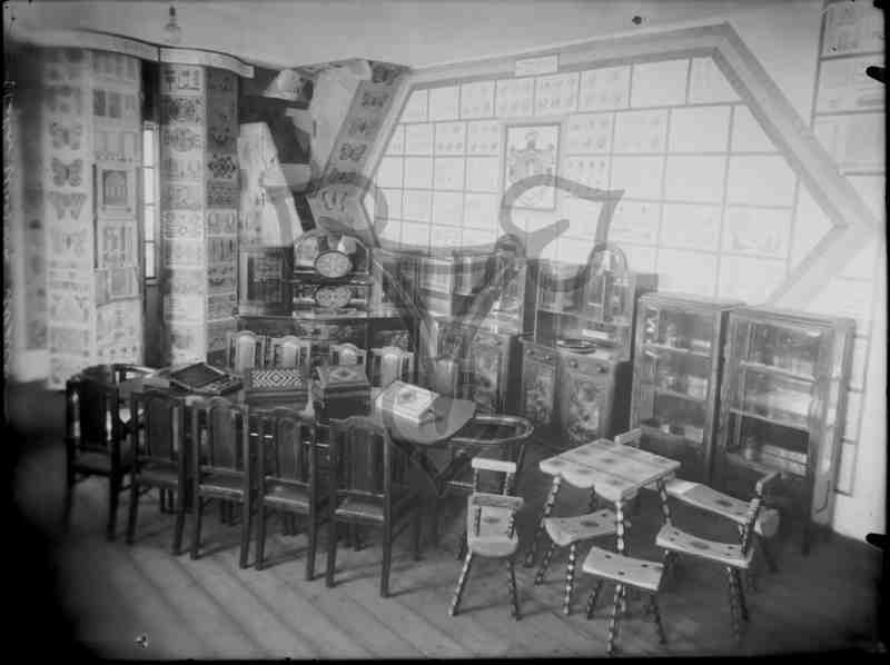 Blick in den Klassenraum einer Schreinerklasse. In einer der Raumecken mehrere Anrichten und Vitrinen nebeneinander aufgestellt. Davor befinden sich zwei Tische, ein großer langer sowie ein quadratischer. Um die Tische sind Stühle und Hocker gestellt. Auf der Platte des großen Tisches befinden sich mehrere Holzschatullen mit Marketerien, die Spielsteine enthalten.