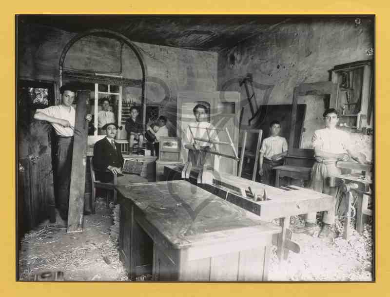 In einem Raum steht am unteren Bildrand mittig ein Katheder, dahinter mehrere Werkbänke sowie Kleinmöbel. Der Ausbilder sitzt im Hintergrund links auf einem Stuhl, trägt eine Baskenmütze und hält ein halb aufgeschlagenes Heft in der Hand. Um ihn im Raum verstreut mehrere Lehrlinge, die teils an den Werkbänken stehen und mit Werkzeugen Werkstücke bearbeiten oder halten solche in der Hand. Alle blicken in die Kamera.