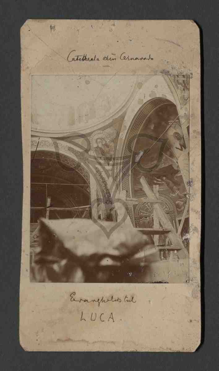 Innenansicht des Kirchenraums. Auf einem Pfeiler unterhalb der Kuppel ist hinter einem Baugerüst(?) die Wandmalerei mit dem Evangelisten Lukas zu erkennen.