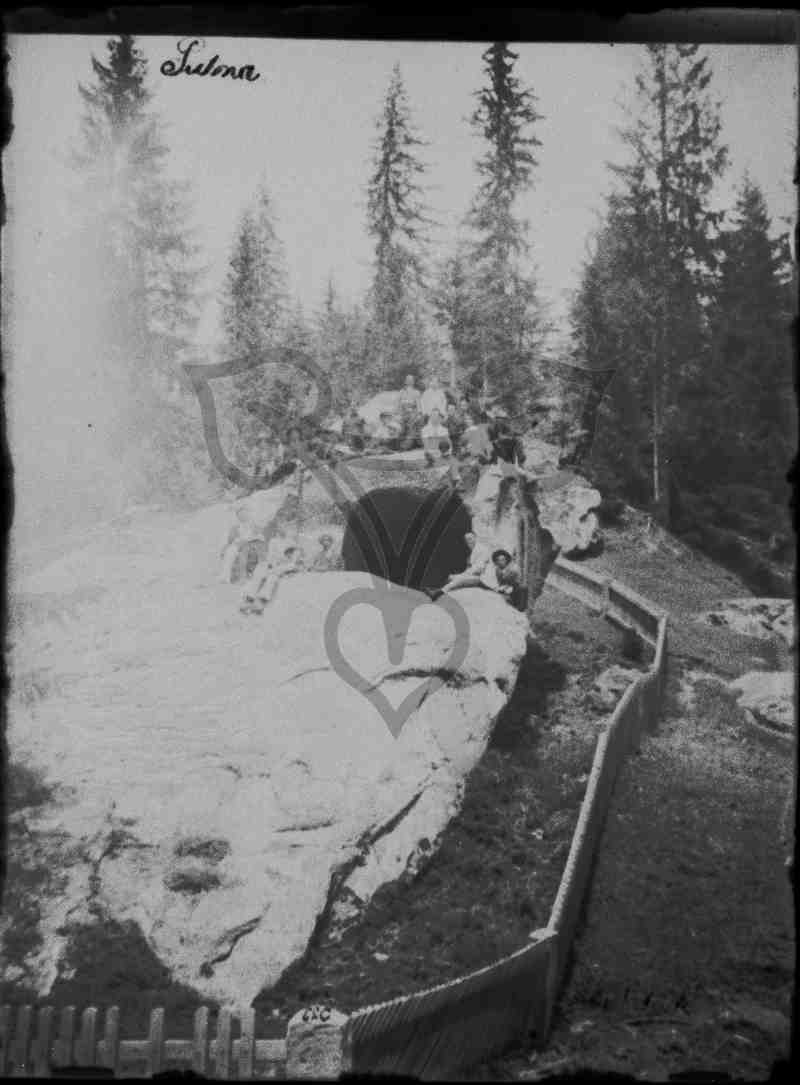 Auf einem bewaldeten Hügel ist der Eingang zu einem Schacht zu erkennen, auf dem und neben dem Männer sitzen und in die Kamera blicken. Die Hügelkuppe mit Schachteingang ist mit einem Bretterzaun umzäunt.