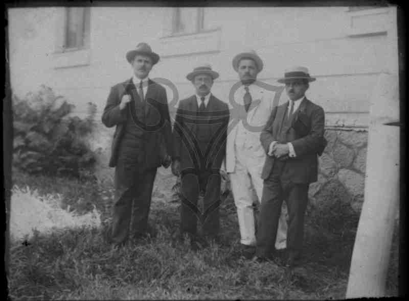 Vor einer Gebäudewand stehen vier Männer. Drei von ihnen tragen dunkel Anzüge, der zweite von rechts einen weißen.
