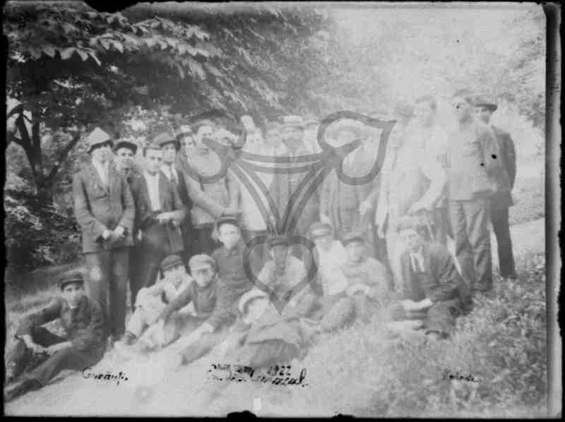 In mehreren Reihen stehen Männer halbkreisförmig aufgestellt in einer Parkanlage(?). Zu ihren Füßen sitzen Jungen und jüngere Männer auf einer Grünfläche. Fast ausnahmslos blicken sie in die Kamera. Im Hintergrund am linken und rechten Bildrand fast mittig ist ein geschotterter Weg zu erkennen.