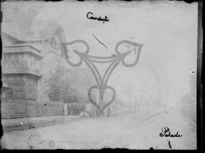 Auf der stark beschädigten Platte ist eine Straßenflucht mit nicht näher identifizierbaren Gebäuden zu erkennen. Vor einem der Gebäude steht eine Personengruppe.