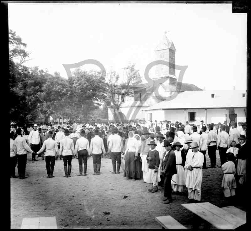 Volksfest auf dem Dorfplatz von Comani. Vor der Kirche und den angrenzenden Gebäuden steht eine große Menschenmenge beiderlei Geschlechts und unterschiedlichsten Alters. Bildmittig eine Reihe Uniformierter, die mit zum Tanz gefassten Händen dem Betrachter den Rücken zuwenden. Davor und dahinter Zuschauer und Volksfestteilnehmer. Am unteren Bildrand angeschnitten Bierzeltgarnituren.