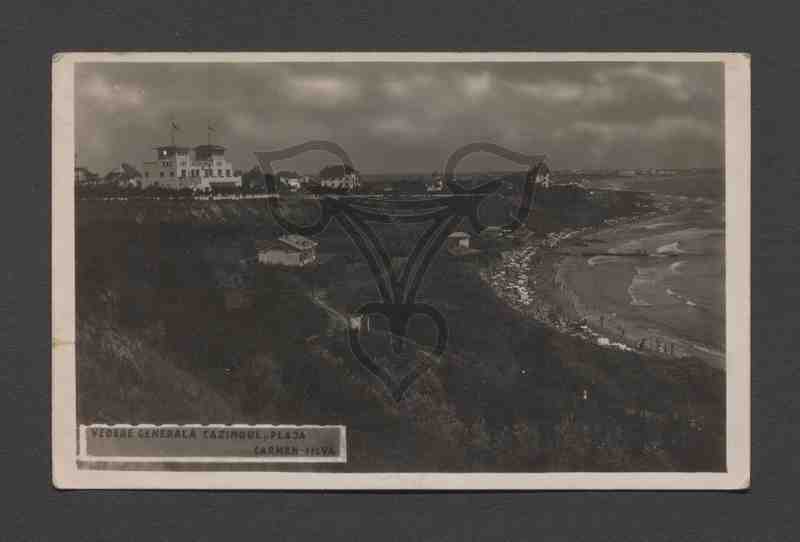 Uferlandschaft mit mehreren verstreut liegenden Gebäuden und einem Strand entlang der Schwarzmeer-Küste. In der linken oberen Ecke auf dem Carmen-Sylva-Hügel das Casino mit den beiden Turmartigen Obergeschossen.