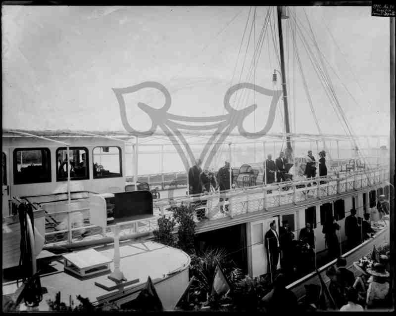 Bildmittig auf dem Oberdeck der königlichen Jacht der Uniform tragende König Ferdinand I. von Rumänien. Hinter ihm steht ein Zivilist, neben ihm ein Uniformierter. Weiter rechts im weißen Kleid in einem Rollstuhl sitzend Königin Elisabeth von Rumänien (Carmen Sylva) umgeben von mehreren Bediensteten. Auf dem Unterdeck an der Reling sowie auf dem Landedock weitere Personen.