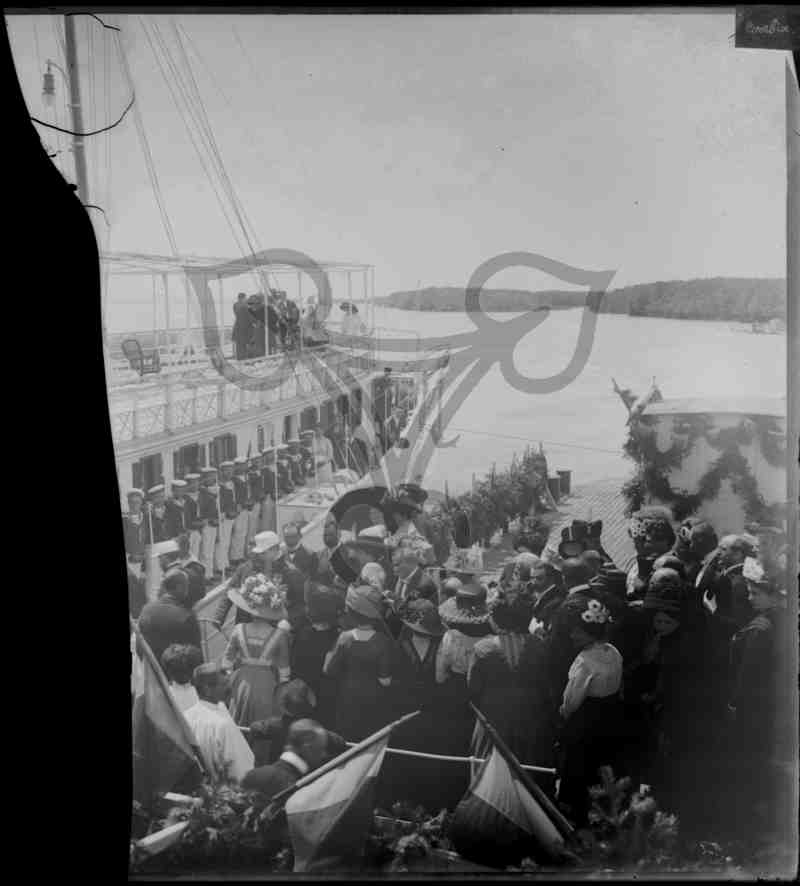 Abbildung der angelegten königlichen Jacht in Corabia. Auf dem unteren Deck sowie dem blumengeschmückten Laufsteg Personen in zivil und Uniform. Am Heck des Oberdecks im weißen Kleid in einem Rollstuhl sitzend Königin Elisabeth von Rumänien umgeben von mehreren Bediensteten. Glasplatte gebrochen, Fragment zu PB 207/464.