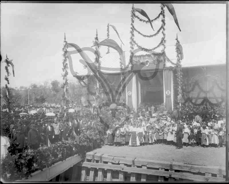 Blick von der königlichen Jacht in Corabia auf die am Ufer versammelte Menschenmenge. Im Hintergrund ein festlich geschmücktes Gebäude.