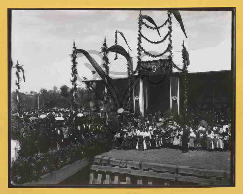 Blick von der königlichen Jacht in Corabia auf die am Ufer versammelte Menschenmenge. Im Hintergrund ein festlich geschmücktes Gebäude.