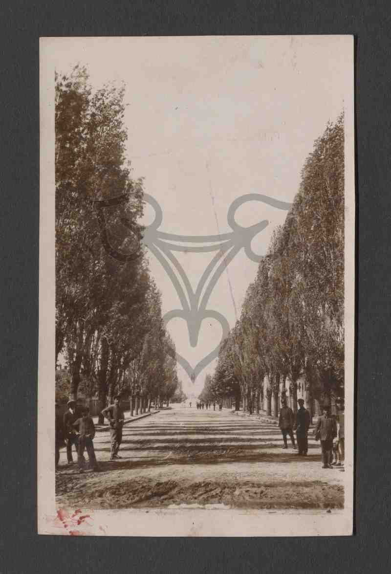 Blick auf eine Allee. Am linken und rechten Bildrand stehende Männer. Im Hintergrund das Ehrenmal des rumänischen Unabhängigkeitskrieges von 1877, Monumentul Independenței.