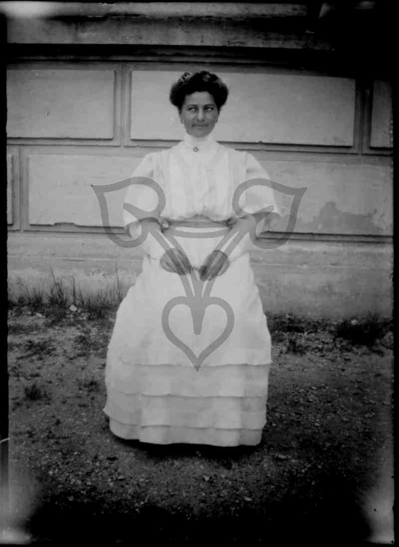 Vor einer hellen Wand im Freien sitzt eine Frau auf einem Stuhl und blickt an der Kamera vorbei.