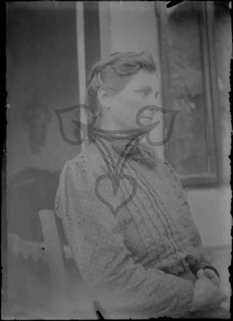 Die Frau ist mit einer weiß gepunkteten dunklen Bluse bekleidet, sitzt im Freien auf einem Stuhl nach rechts gewandt.