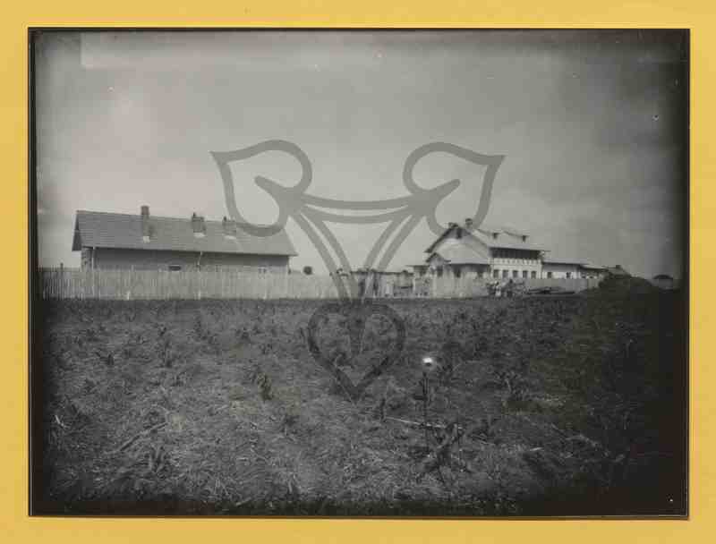 Von einem Feld mit niedrigem Pflanzenbewuchst wird in der oberen Bildhälfte auf eine hinter einem Holzzaun befindliche Gebäudereihe im Hintergrund geblickt. Vor dem Zaun stehen gruppenweise mehrere Personen, am rechten Bildrand mittig ist auch ein von zwei Kühen gezogener Leiterwagen zu erkennen.